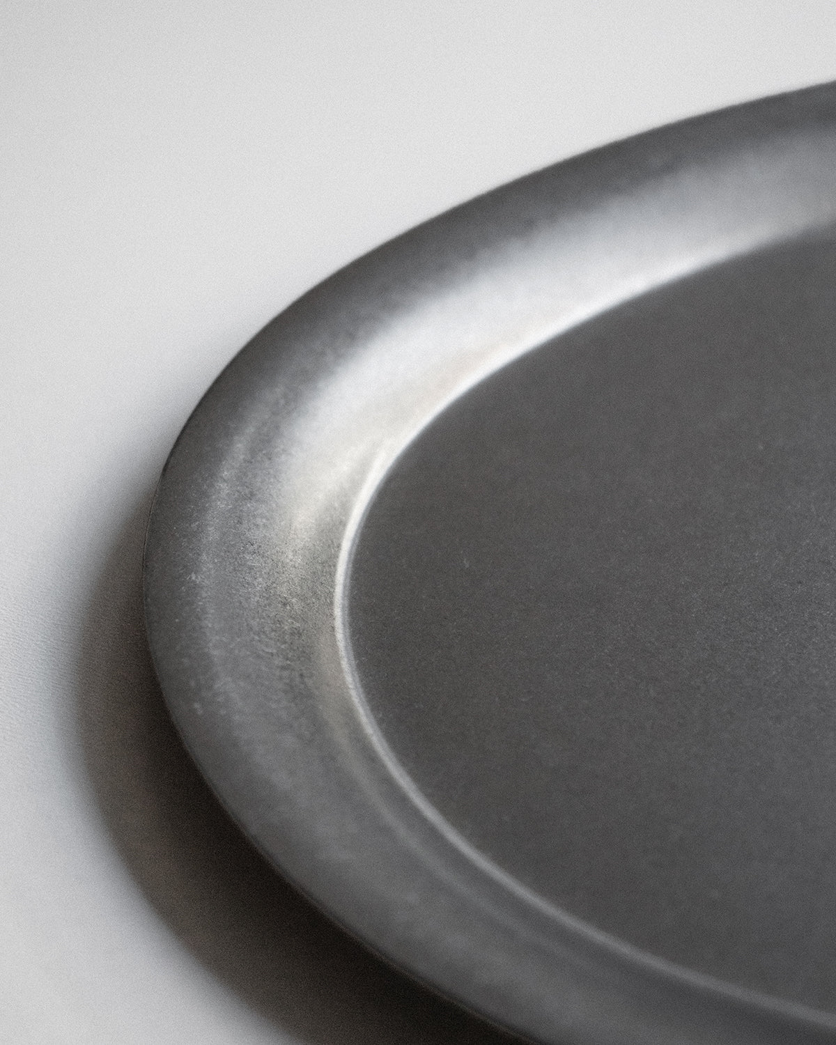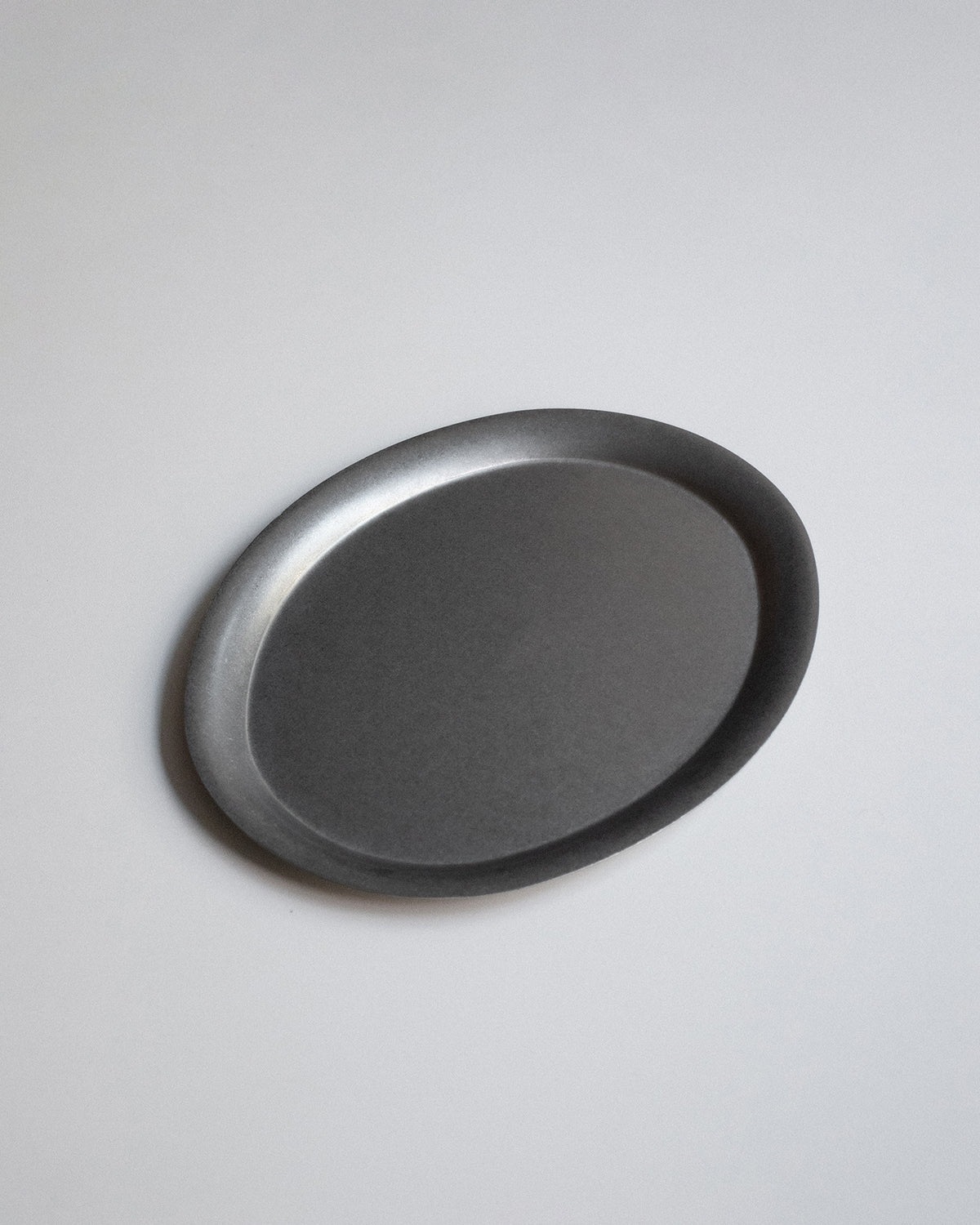 Plate 002 is made from matte oxidised stainless steel, designed to be a lasting part of everyday use. With its 220 by 285 millimeter surface and 12 millimetre height, it works just as well for serving a main dish as it does for shared meals or appetizers.